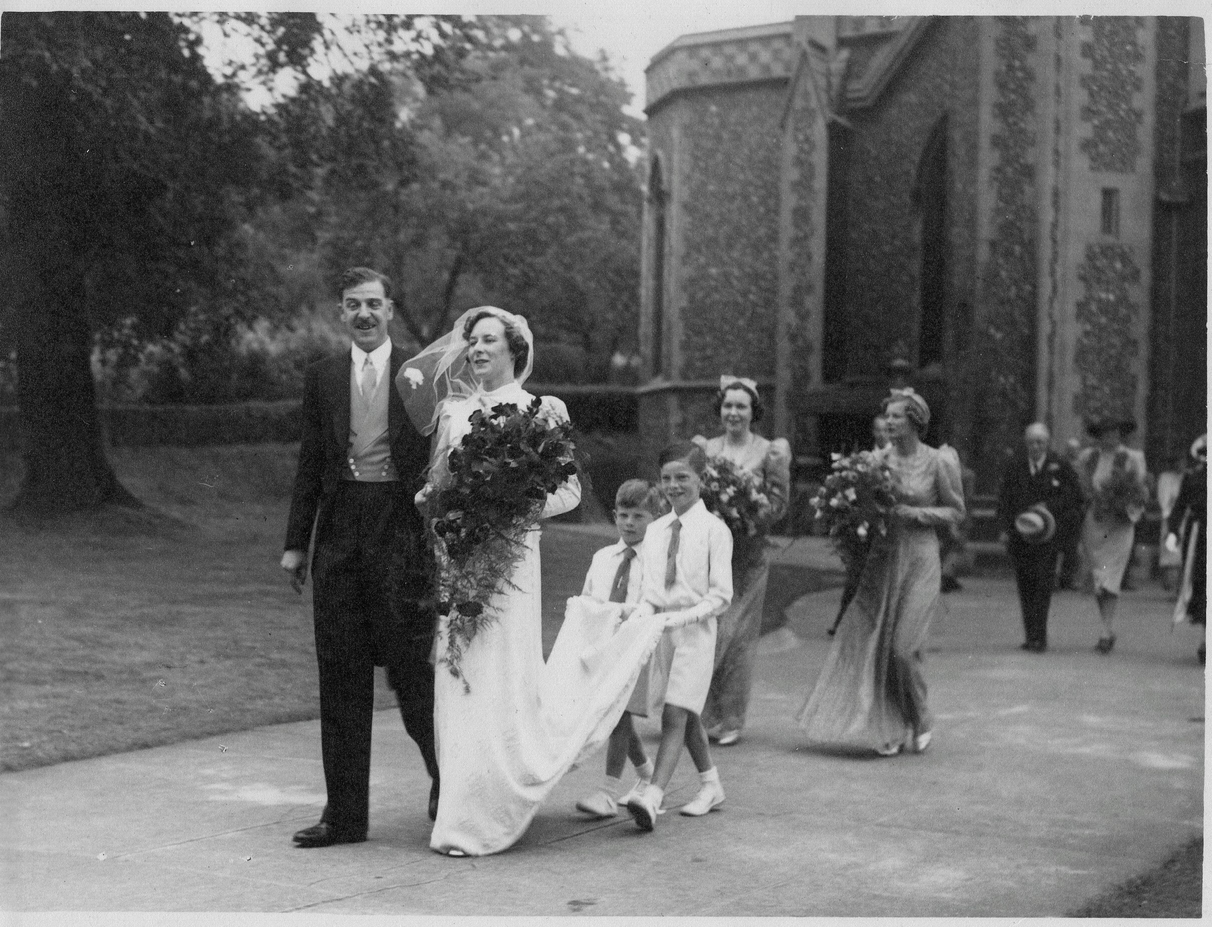 The photo of my parent's wedding taken by a professional photographer, with my two cousins, Graham and Robin, holding her train, and her best friend, Lynn Thomas, one of the bridesmaids.